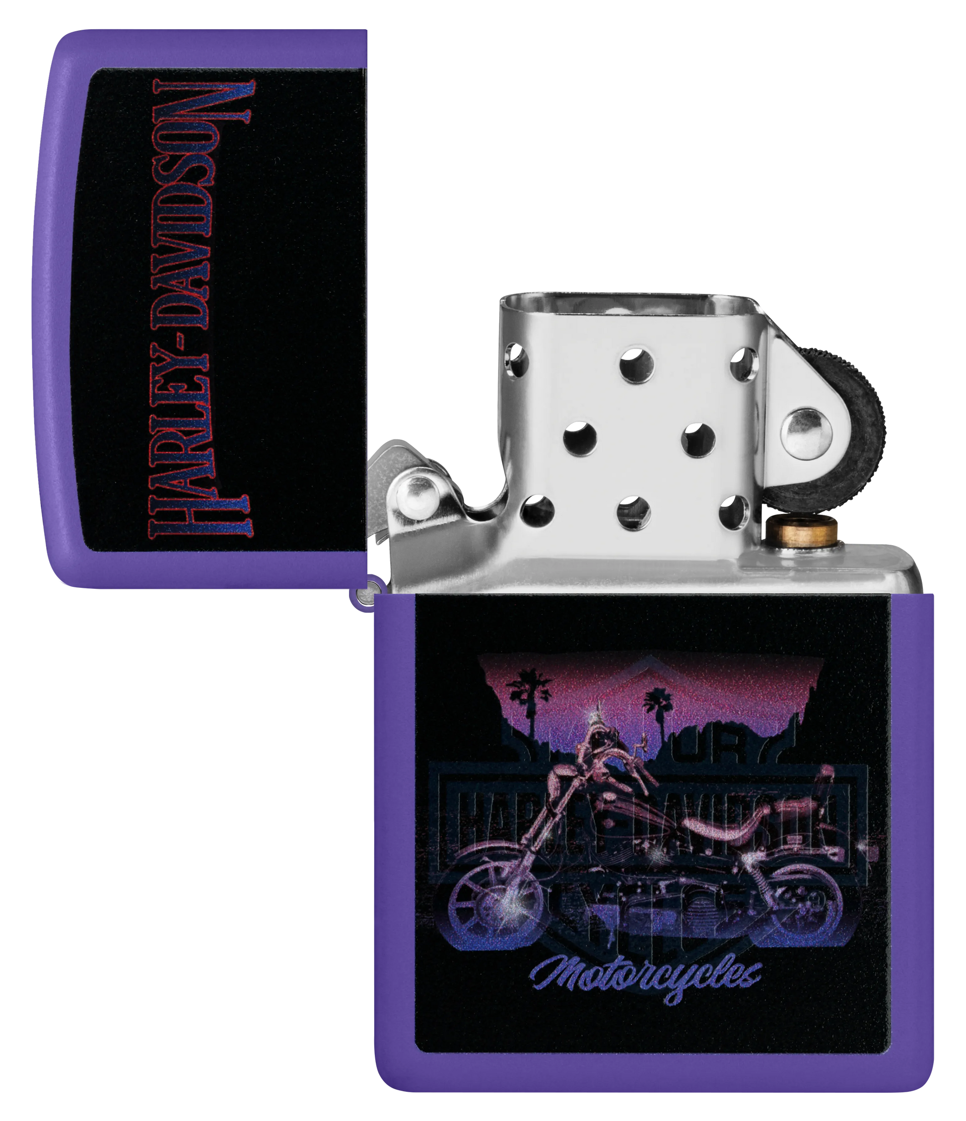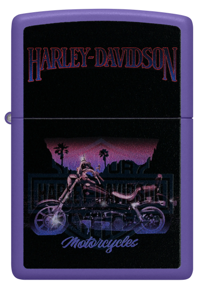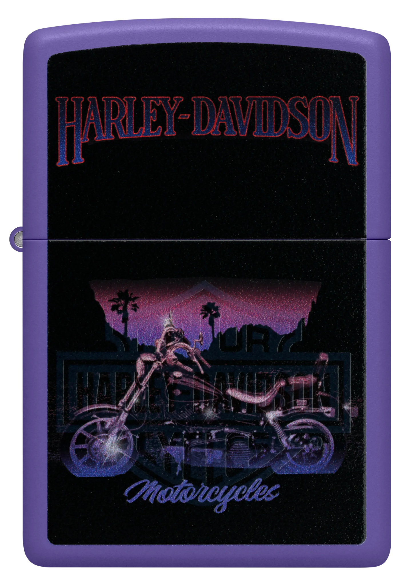 Ta przykuwająca uwagę zapalniczka Purple Matte ozdobiona przy użyciu nastrojowego wzoru Color Image wyróżnia się odwzorowaniem klasycznego motocykla Harley-Davidson. Dzięki naszemu firmowemu procesowi Black Light zobaczyć ikoniczne logo w kształcie tarczy, gdy umieścisz zapalniczkę pod światłem ultrafioletowym.
