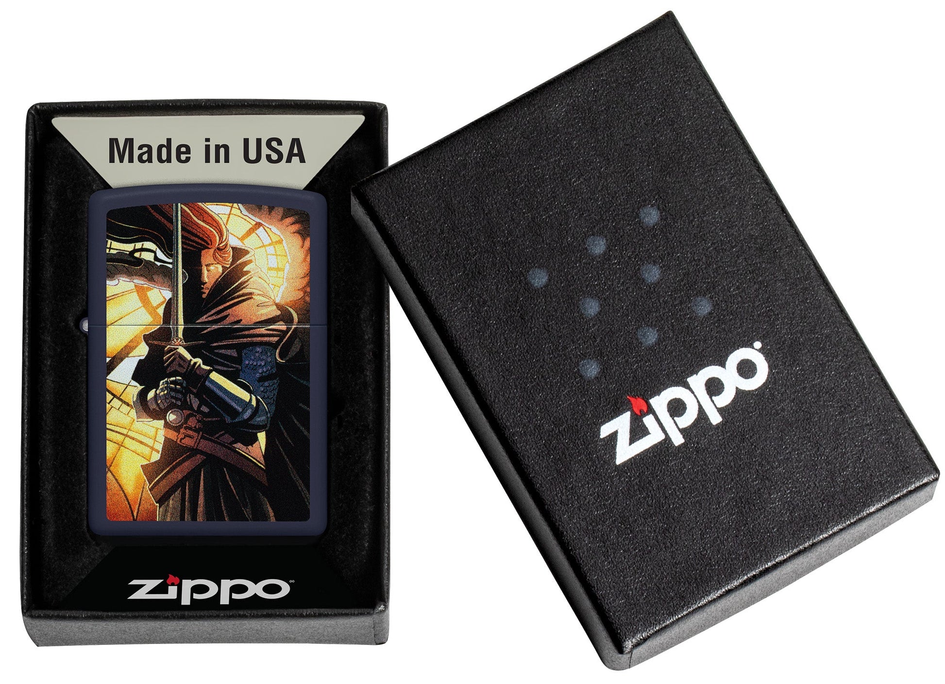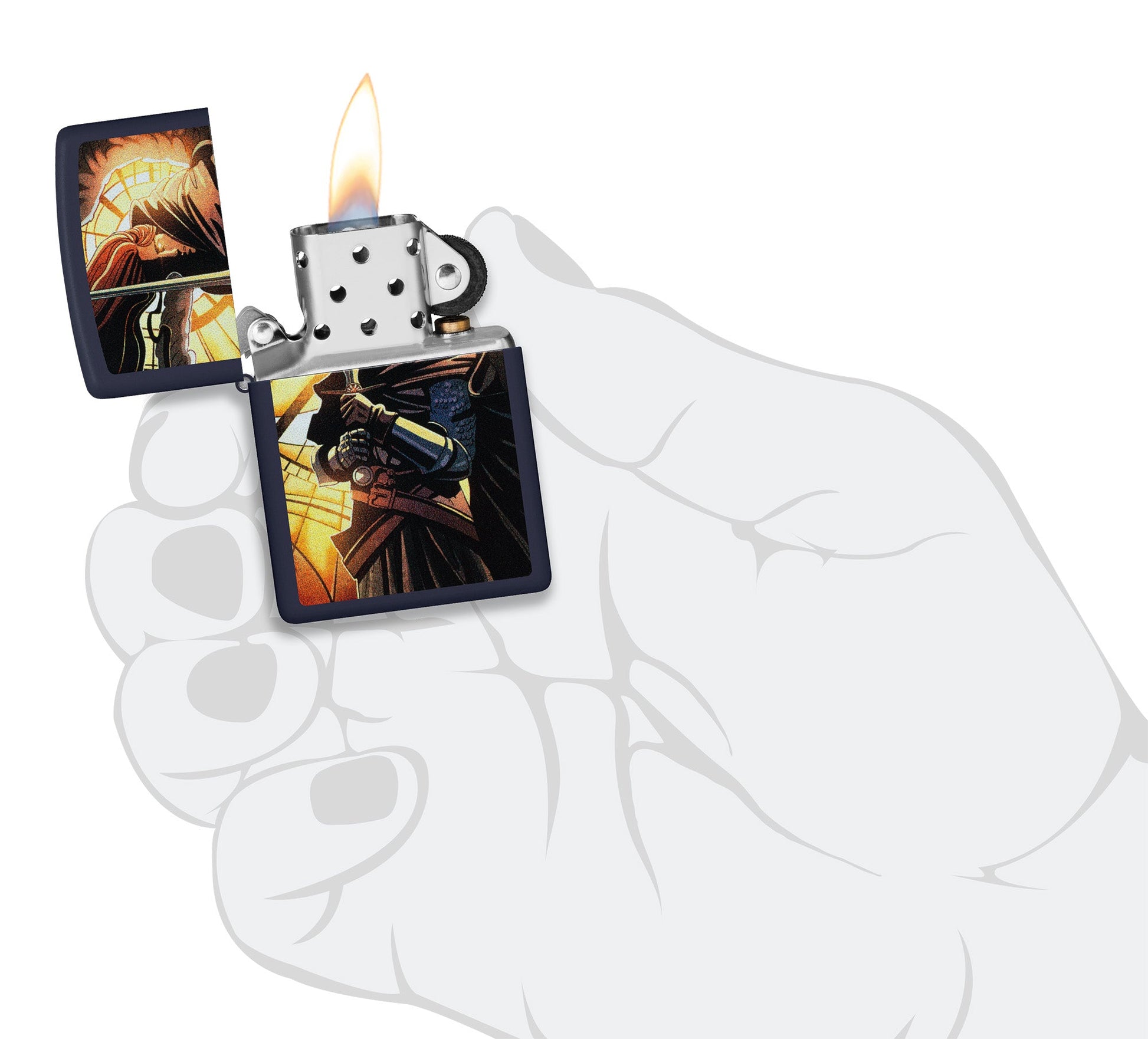 Na tej klasycznej zapalniczce o matowym granatowym wykończeniu nowoczesność spotyka średniowiecze. Na tle świetlistej poświaty opancerzony wojownik stoi w gotowości do walki w abstrakcyjnym wzorze wykonanym techniką nadruku kolorowego.
