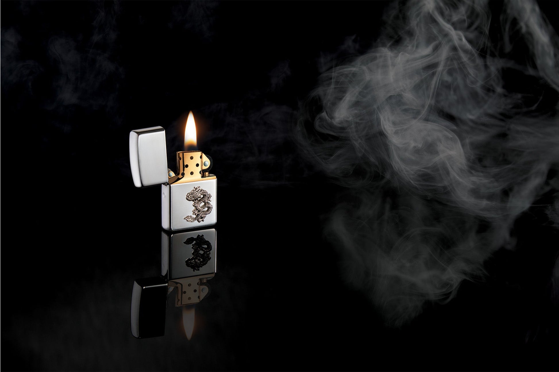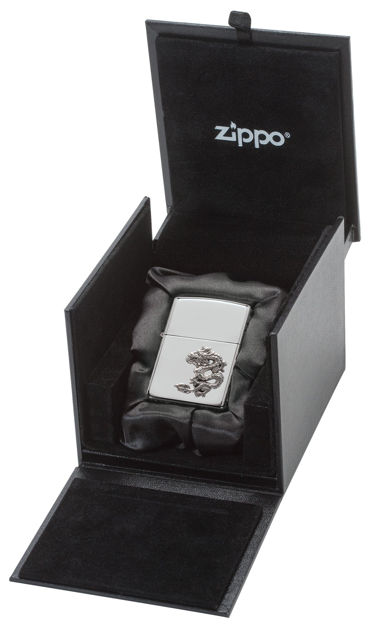 Pomyślny smok wschodni, symbol mocy, siły i szczęścia, rozpościera się na emblemacie ze srebra próby 925, umieszczonym na lustrzanej powierzchni zapalniczki Armor® High Polish Sterling Silver Windproof. Zapalniczka jest zapakowana w pudełko prezentowe. Aby zapewnić optymalną wydajność, napełnij ją paliwem do zapalniczek Zippo.