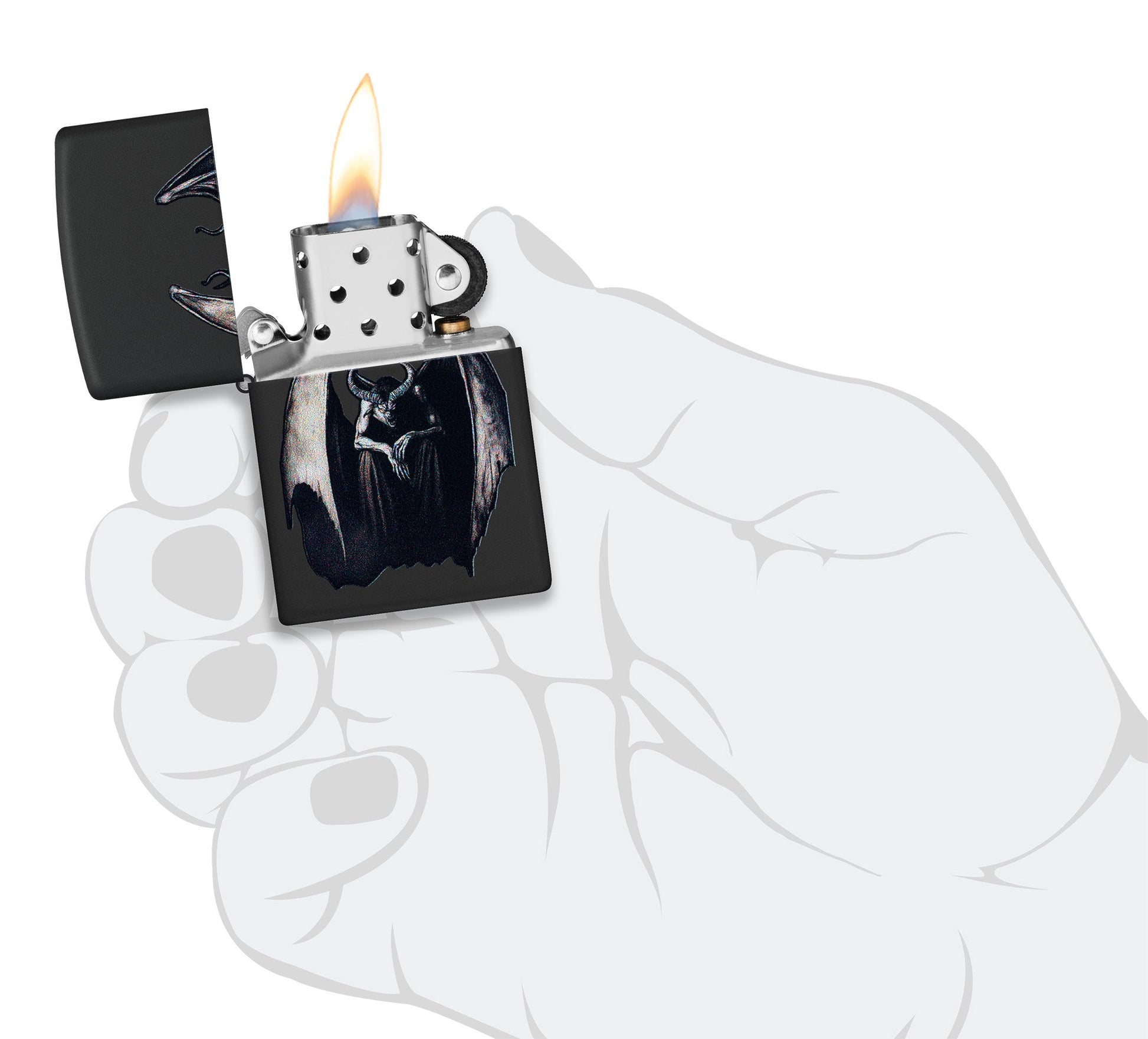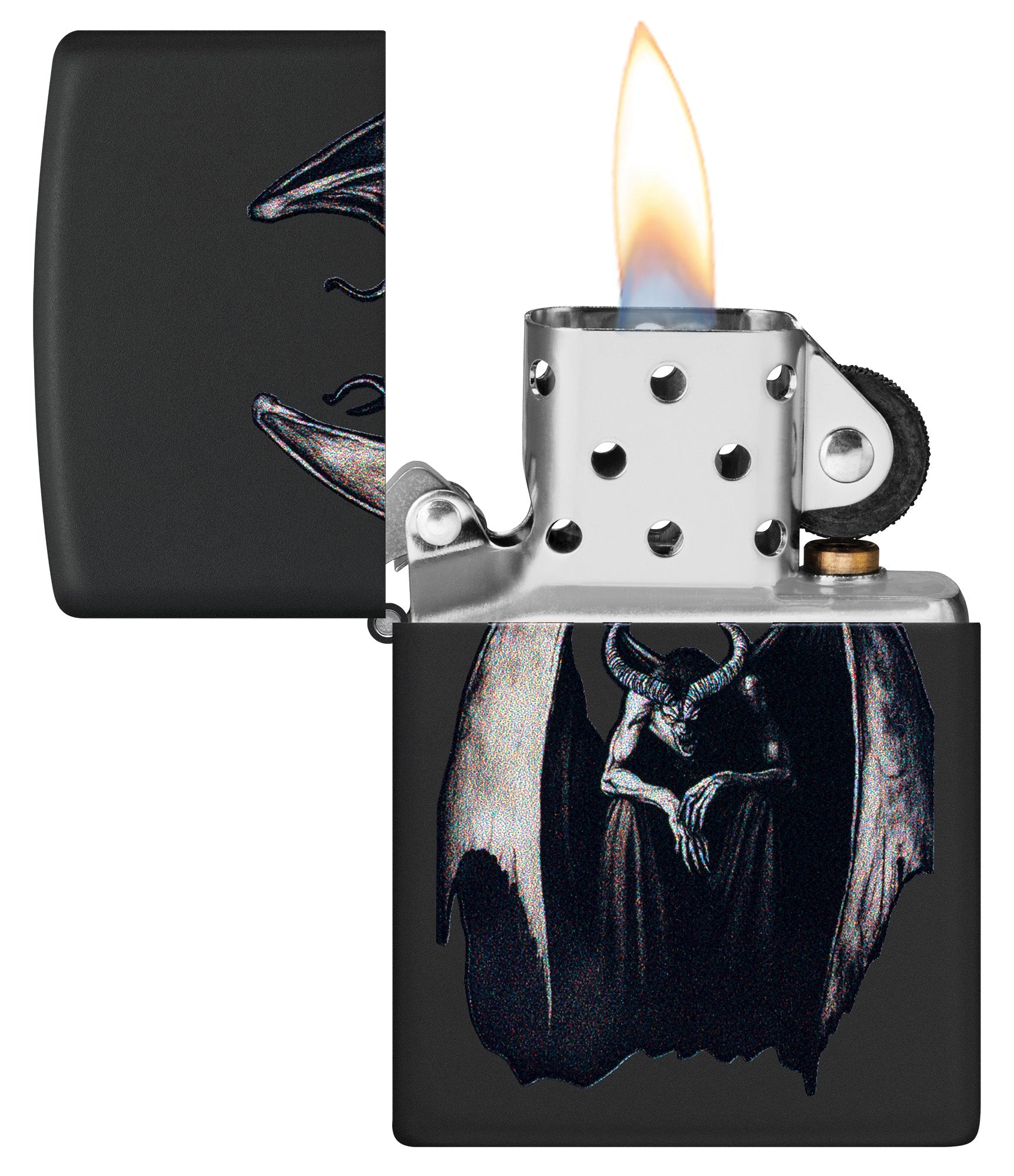 Na powierzchni tej klasycznej zapalniczki o matowym czarnym wykończeniu pozuje nadprzyrodzone monstrum z przerażającymi rogami i potężnymi skrzydłami, w upiornym wzorze wykonanym techniką nadruku kolorowego.