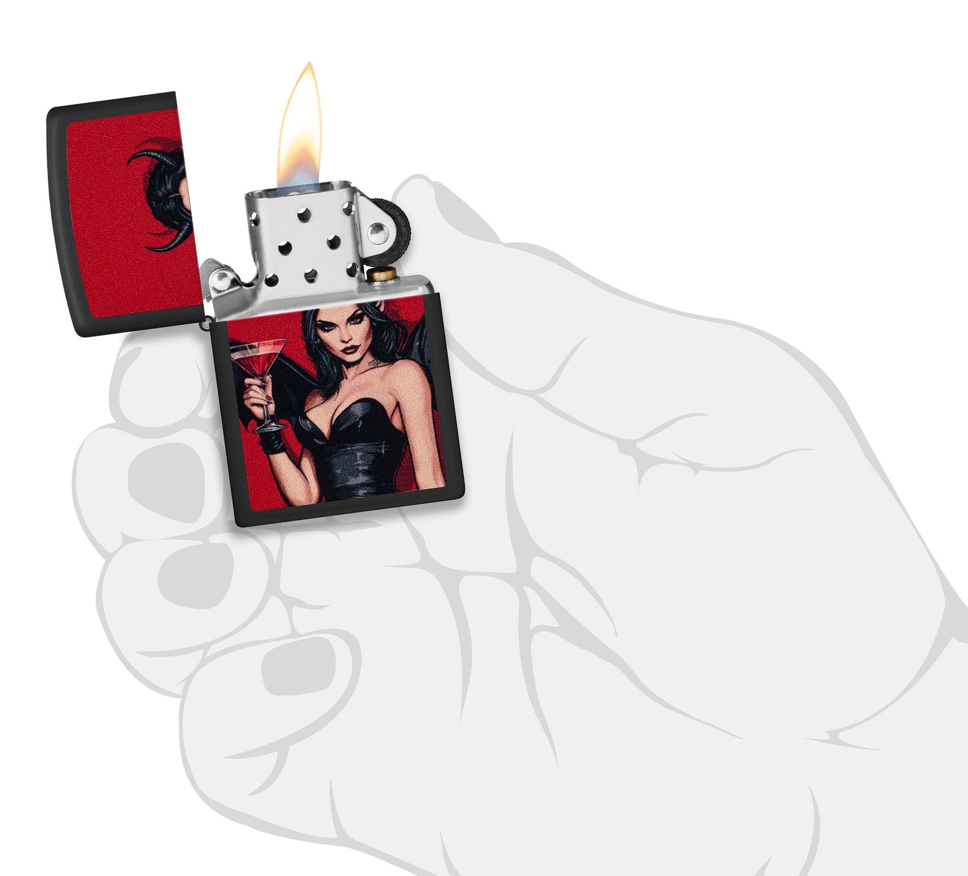 Na powierzchni tej klasycznej zapalniczki o matowym czarnym wykończeniu pozuje demoniczny wampir z kieliszkiem martini w dłoni, w zmysłowym wzorze wykonanym techniką nadruku kolorowego.