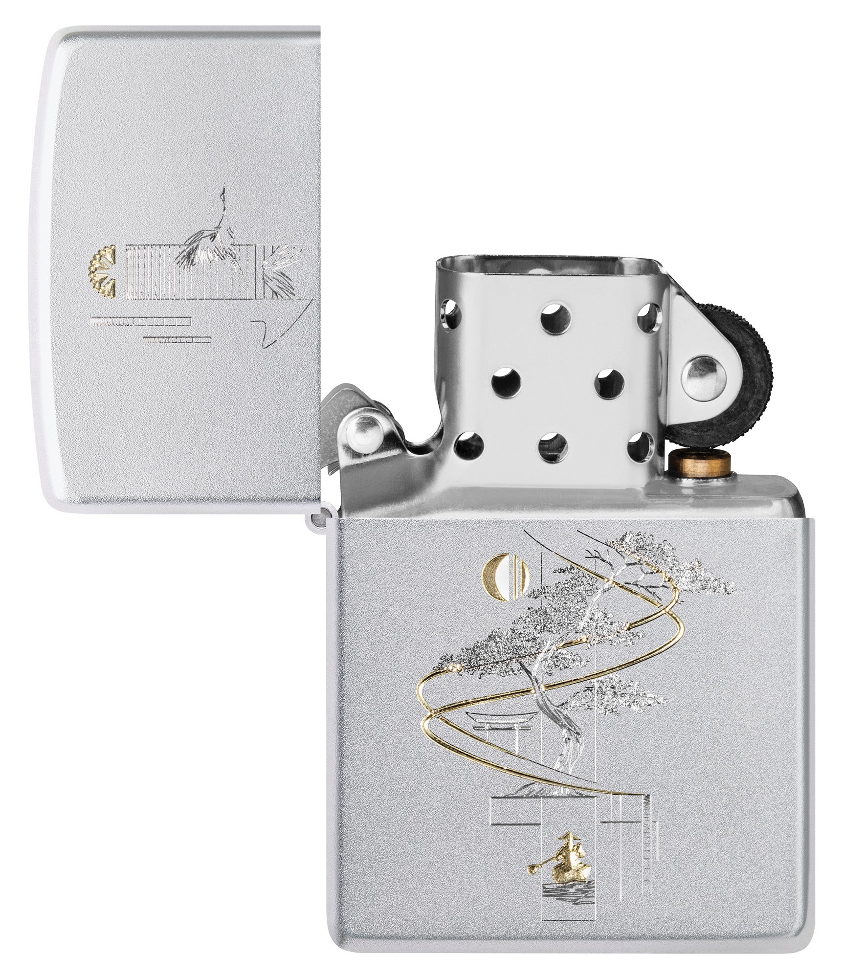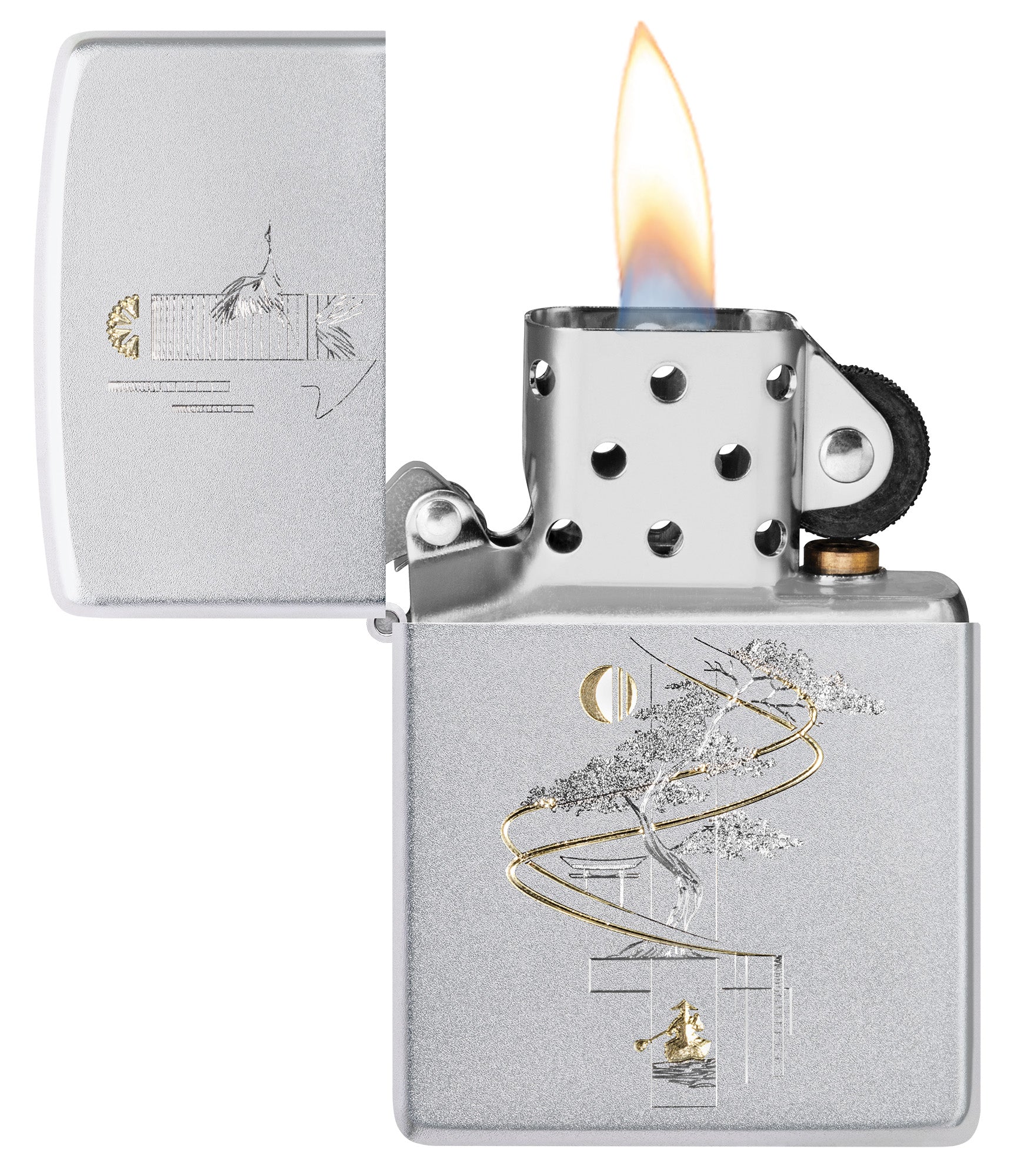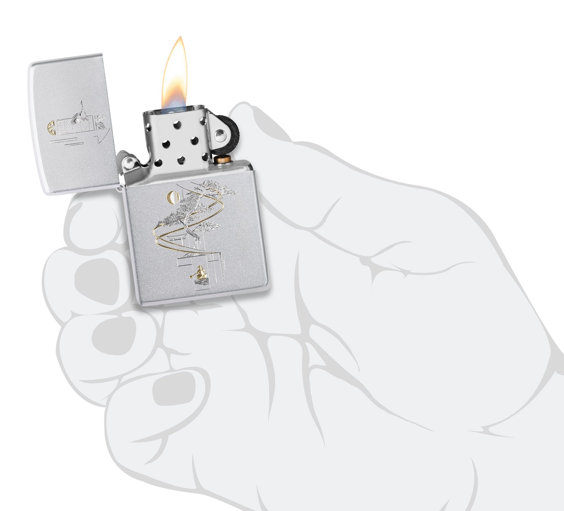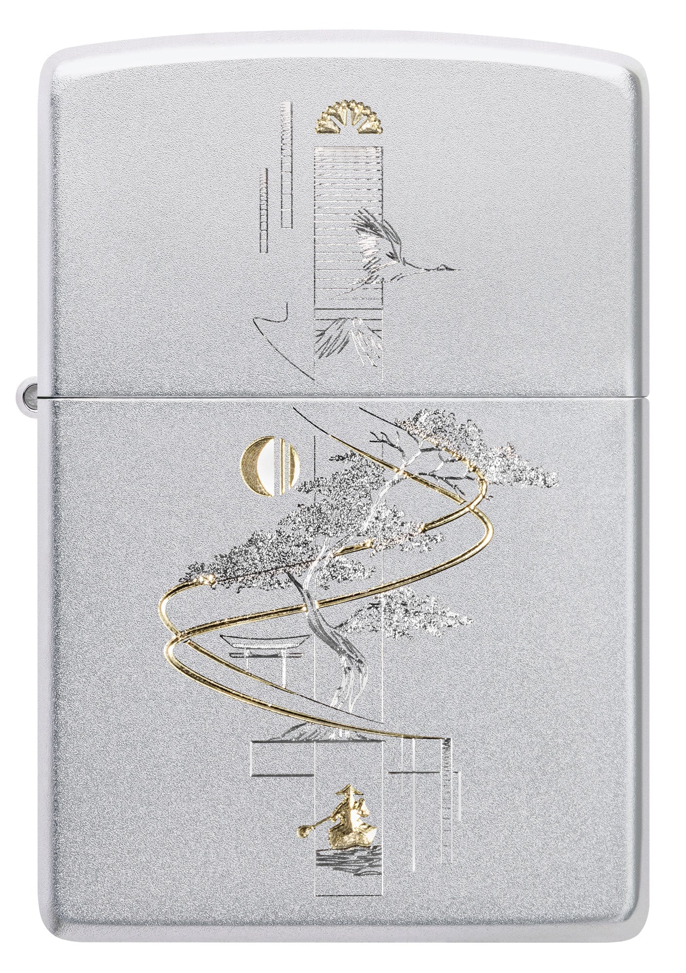 Na tej klasycznej zapalniczce o satynowym chromowanym wykończeniu przedstawiono delikatne drzewko bonsai, symbolizujące harmonię między sztuką a naturą, w kojącym wzorze Auto.