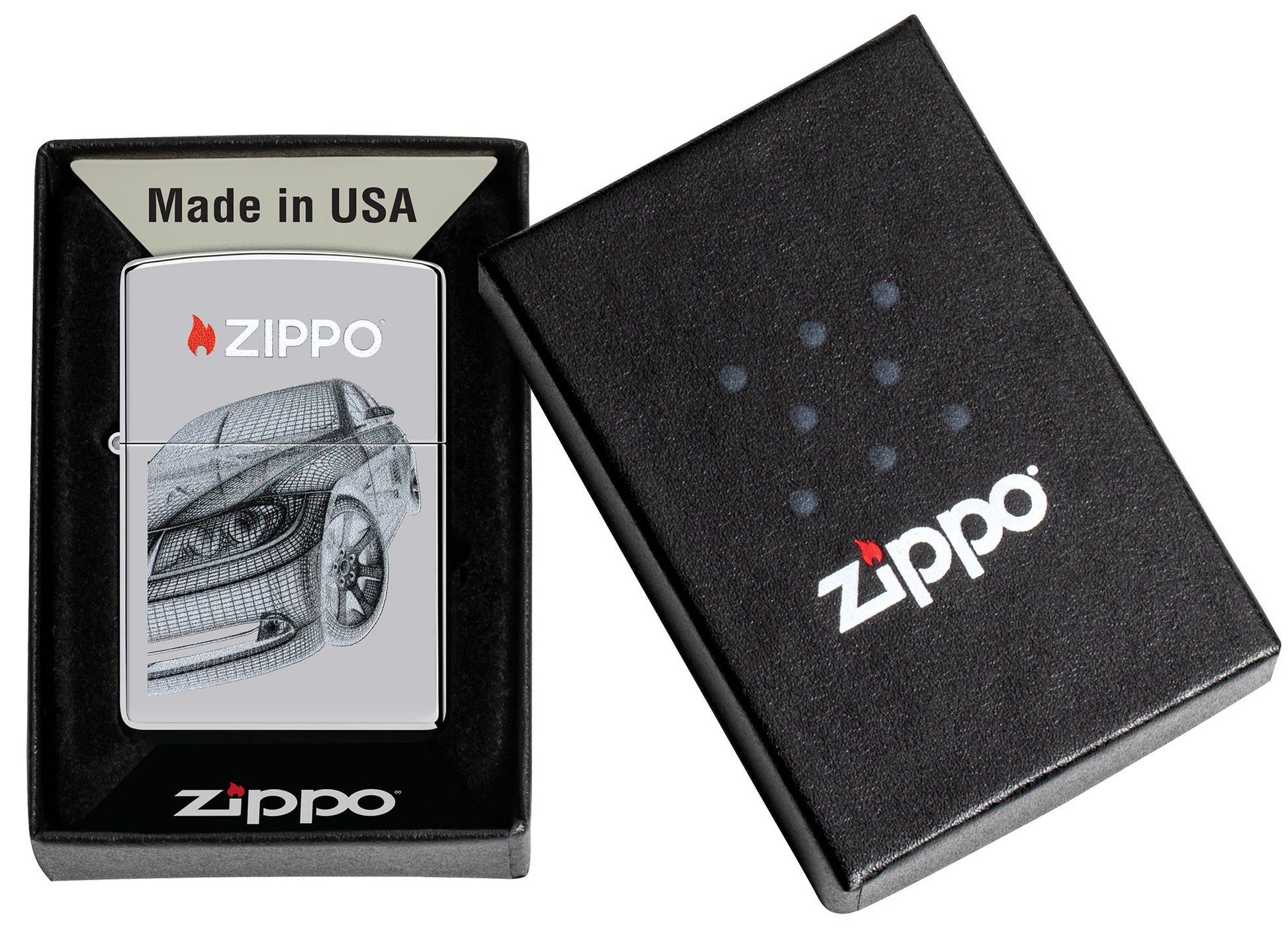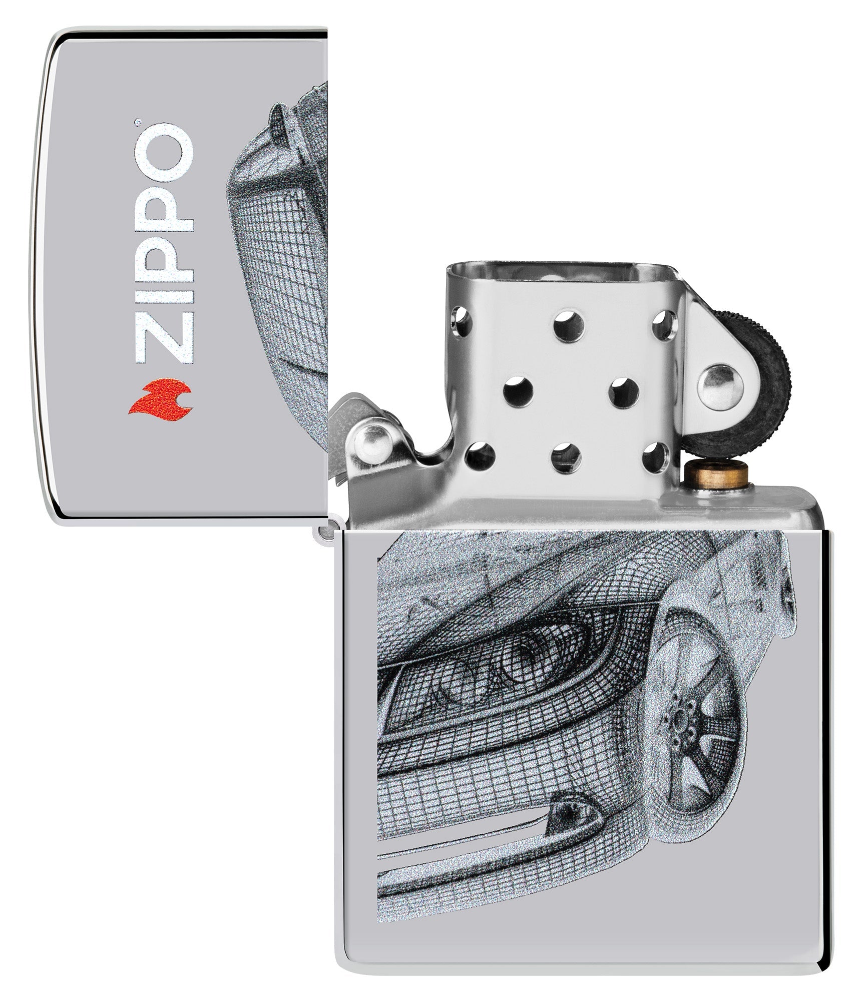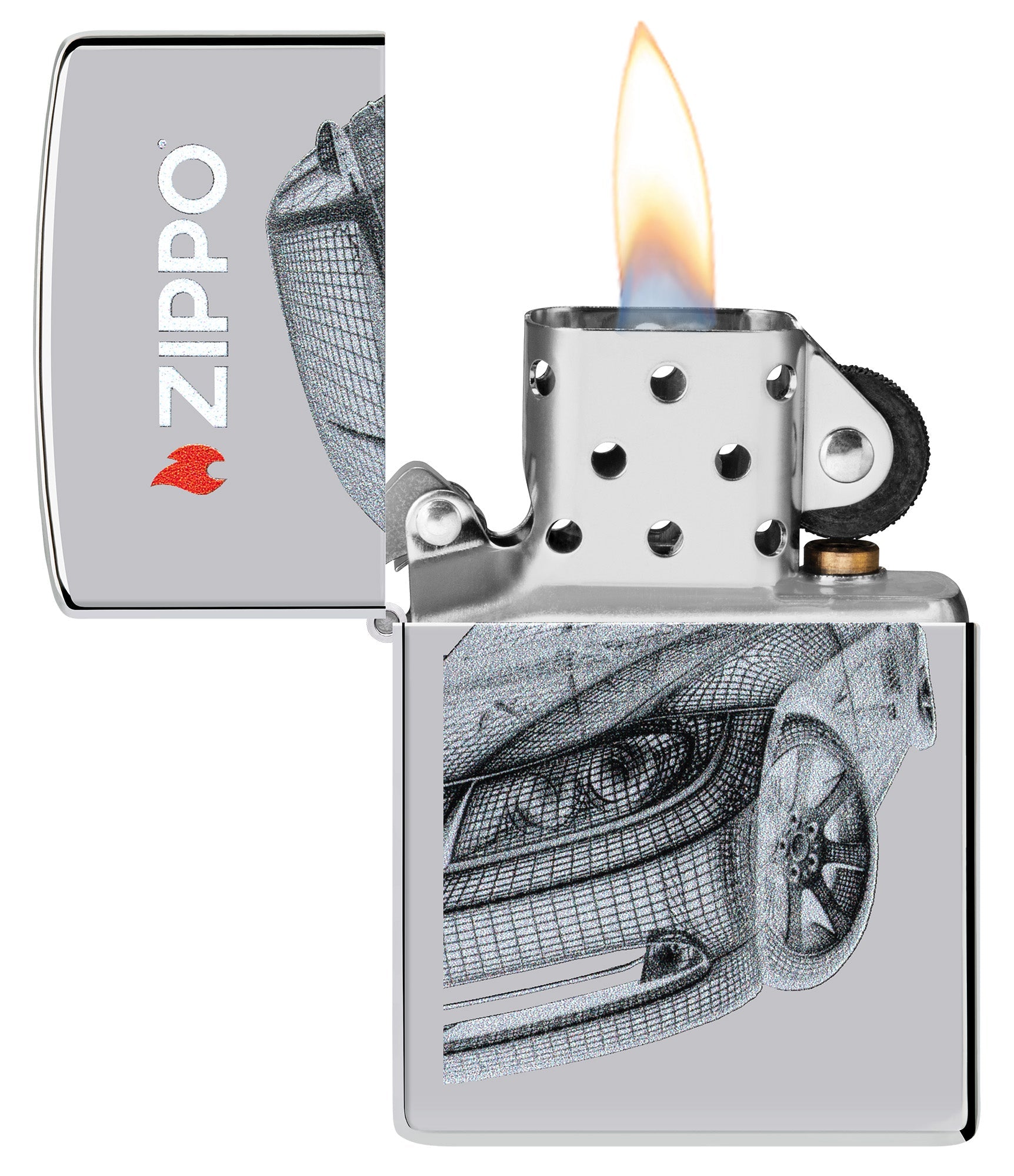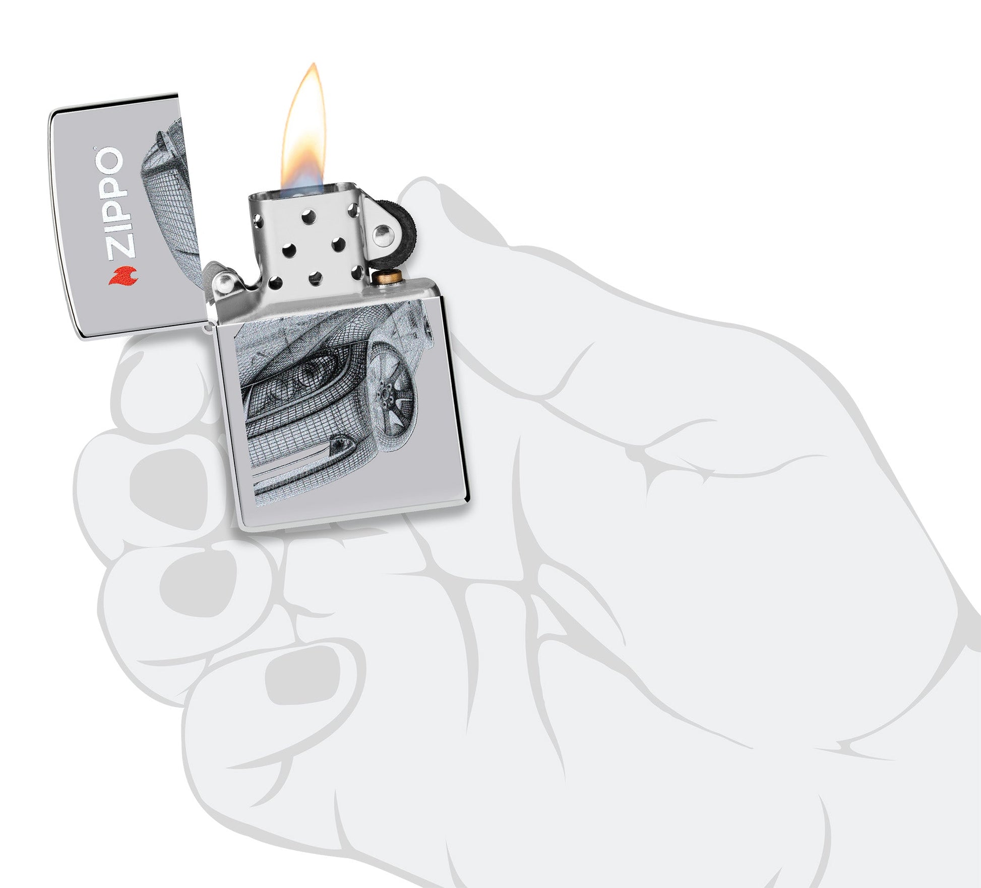 W nowoczesnym, zdigitalizowanym stylu sportowy samochód pędzi na pierwszy plan tej klasycznej zapalniczki o polerowanym chromowanym wykończeniu w futurystycznym wzorze wykonanym techniką nadruku kolorowego.