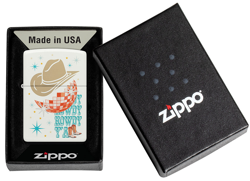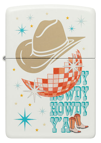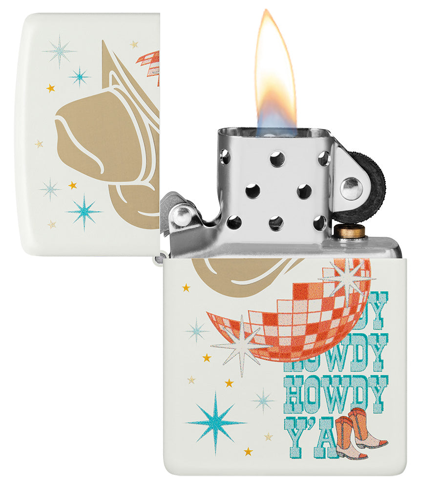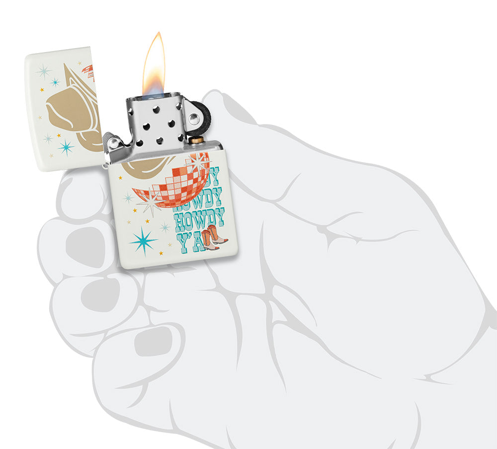 Ta klasyczna zapalniczka White Matte jest gotowa na dobrą zabawę. Nowa para butów, ostry nowy kapelusz i olśniewająca kula disco pojawiają się w kolorowym obrazie Color Image i laserowym wzorze Laser Engrave dzięki czemu możesz zabrać rodeo ze sobą wszędzie, gdzie jesteś.
