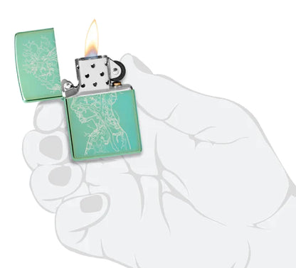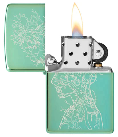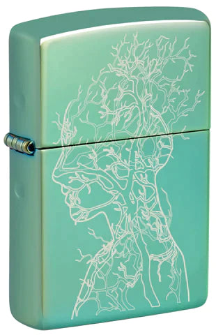 Ta klasyczna zapalniczka High Polish Green celebruje nieodłączny związek między ludzkością a Matką Ziemią. Misterna sieć gałęzi tworzy ludzki kształt w tym głębokim i zadumanym projekcie Laser Fancy Fill.