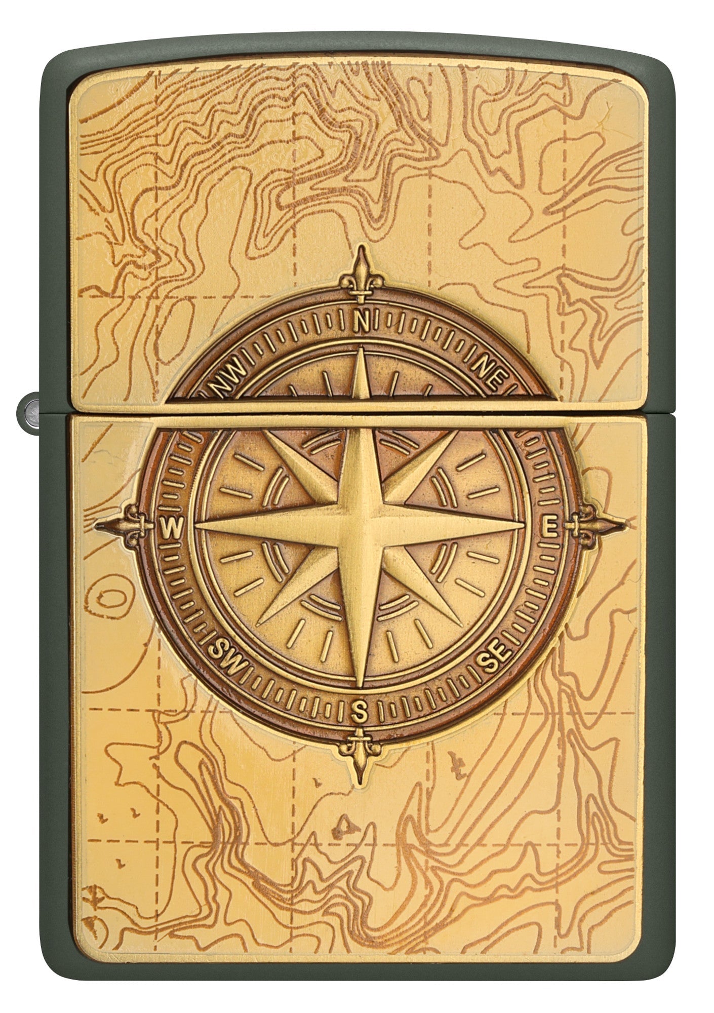 Niech ta klasyczna zapalniczka o matowym zielonym wykończeniu poprowadzi Cię ku przygodzie. Na tle mapy topograficznej, na emblemacie z wypukłą fakturą, widnieje misterny kompas.