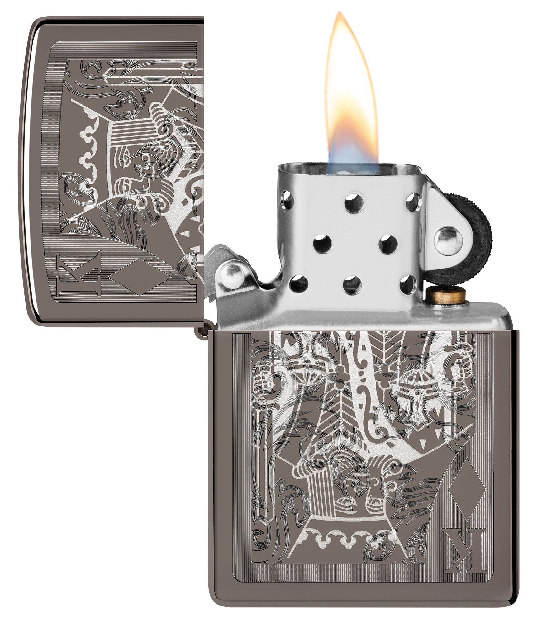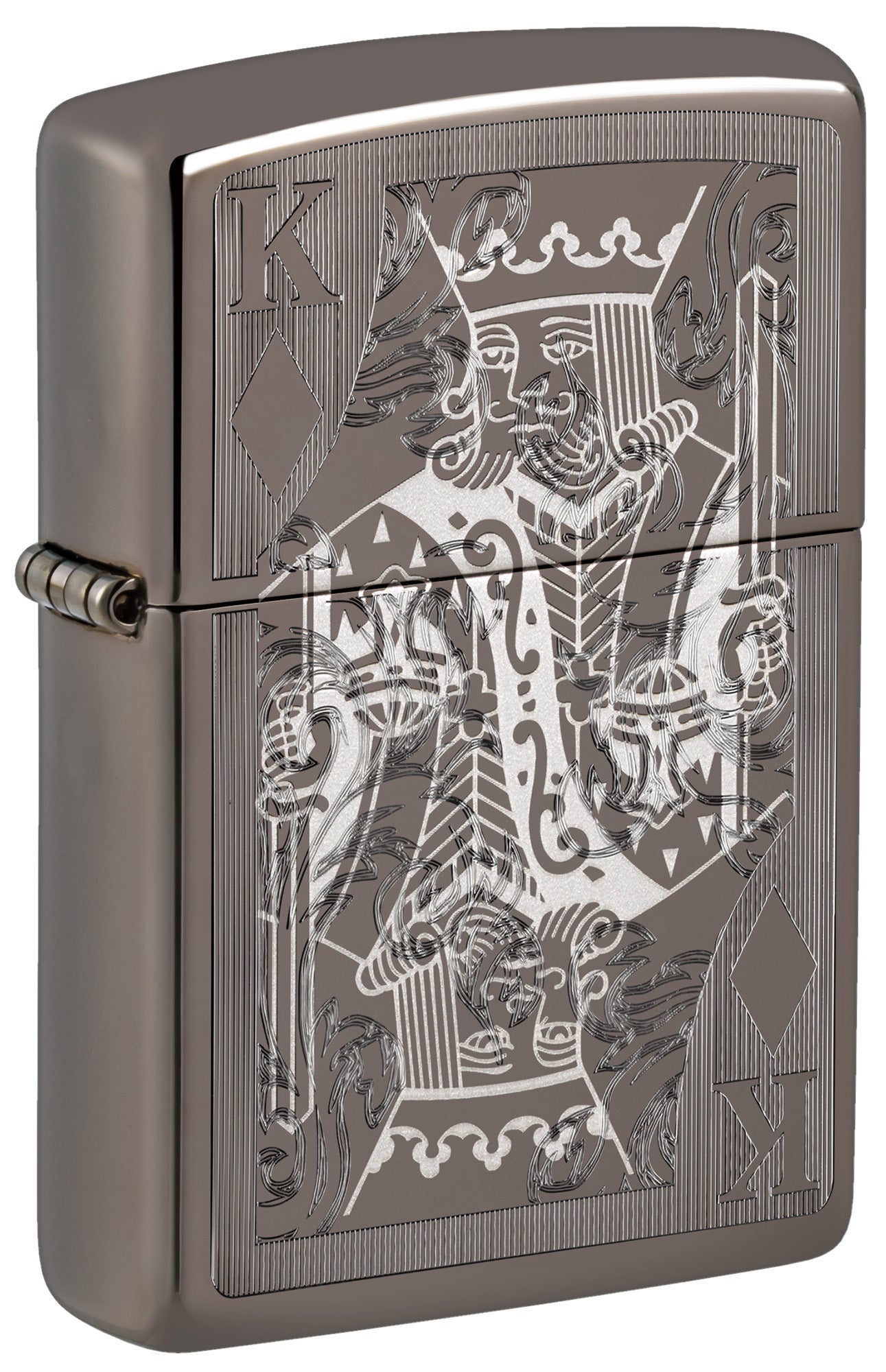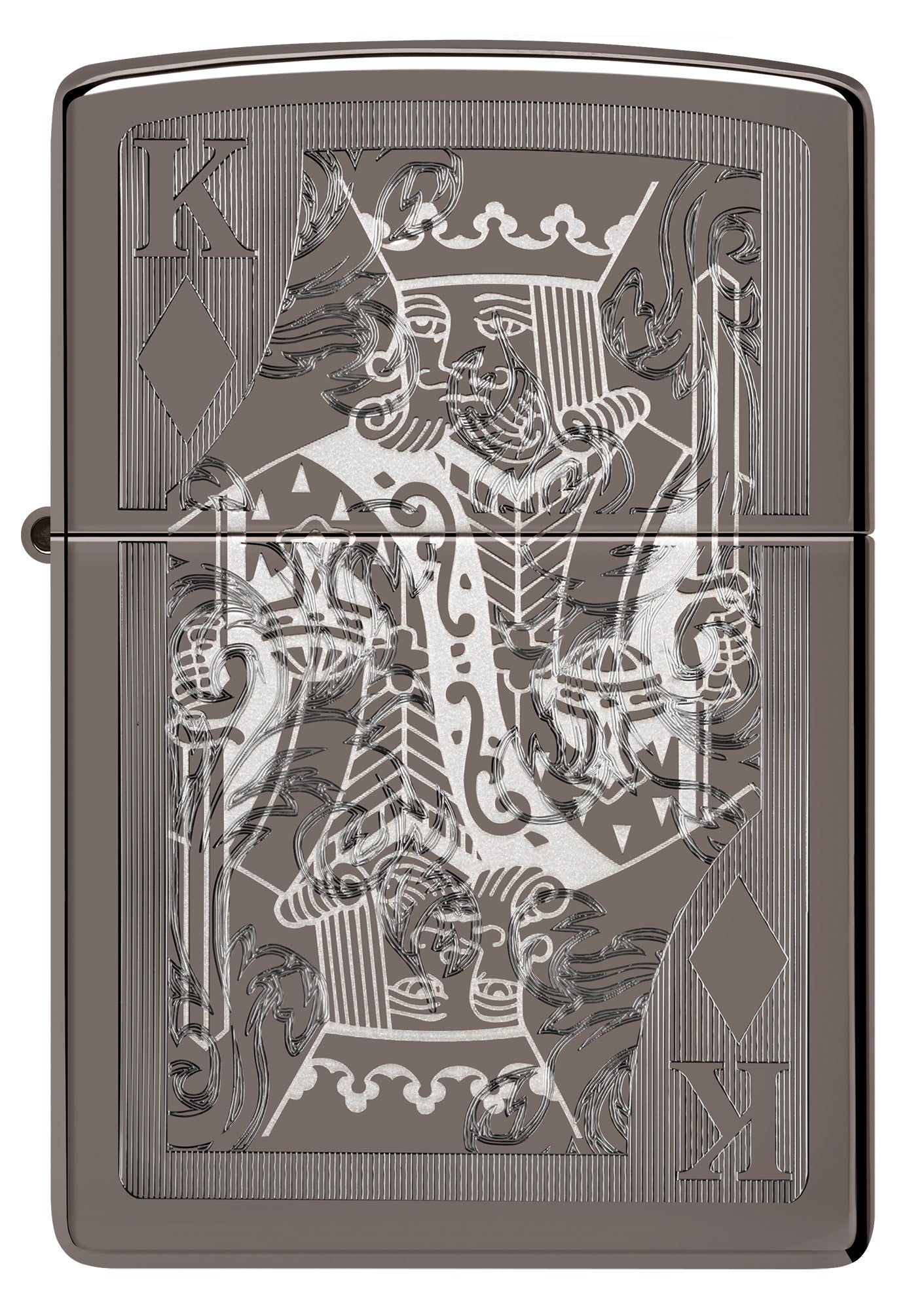 Niech ta klasyczna zapalniczka Black Ice® zdominuje Twoją kolekcję. Misterny wzór króla karo został naniesiony na elegancką powierzchnię z wykorzystaniem technik Auto oraz grawerowania laserowego, co zapewnia luksusową głębię i kontrast.