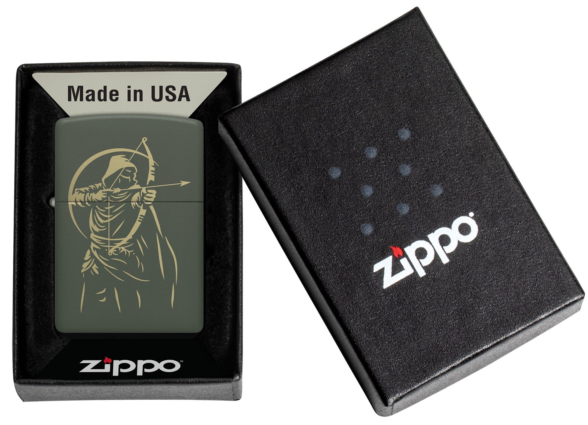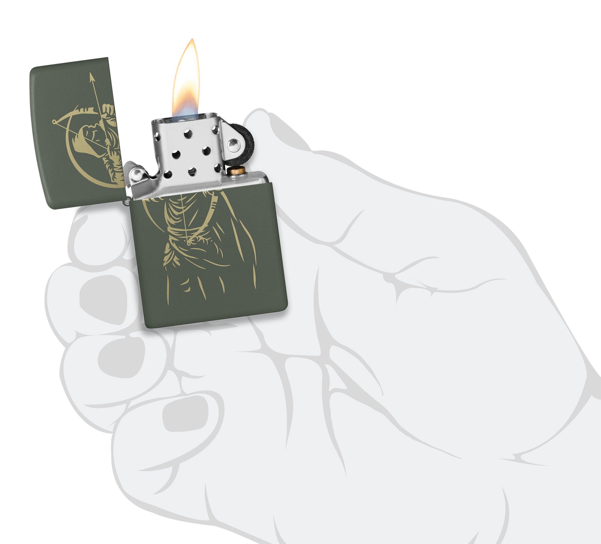 Rzuć okiem na tę klasyczną zapalniczkę o matowym zielonym wykończeniu. Zakapturzony łucznik został przedstawiony z łukiem i strzałą w wyraźnym wzorze wykonanym techniką grawerowania laserowego, który odsłania mosiężny kolor zapalniczki pod matowym wykończeniem.
