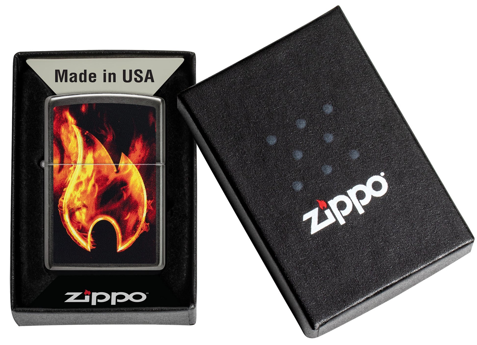 Dodaj odrobinę ognia do swojej kolekcji dzięki tej klasycznej zapalniczce w kolorze szarym. Ikoniczny płomień Zippo spowity jest ogniem w intensywnym wzorze wykonanym techniką nadruku kolorowego.