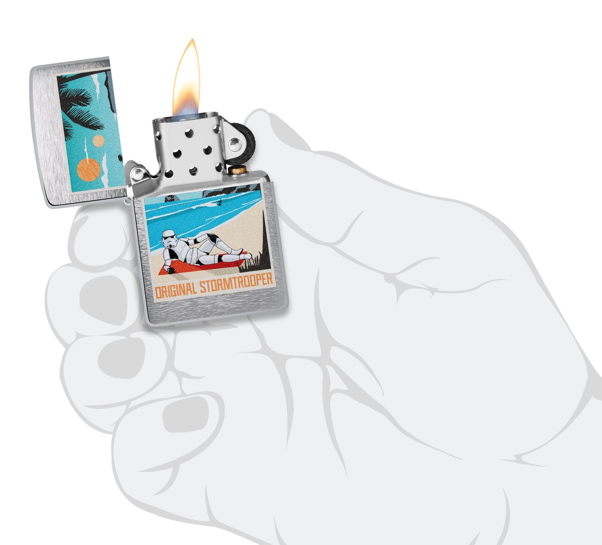 Być może najbardziej rozpoznawalna siła bojowa w galaktyce – kultowy Original Stormtrooper doskonale prezentuje się na klasycznej zapalniczce Brushed Chrome. Wyrazisty wzór Color Image przedstawia ukochanego Stormtroopera odpoczywającego na plaży.