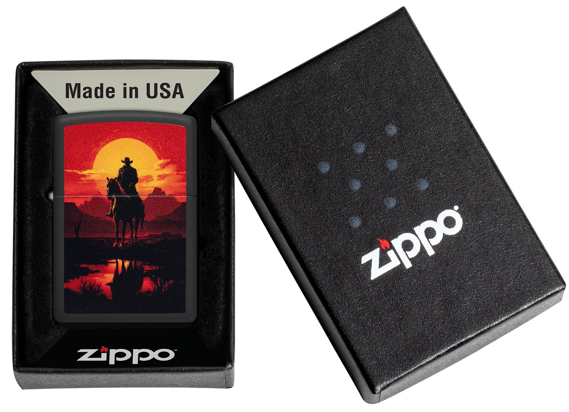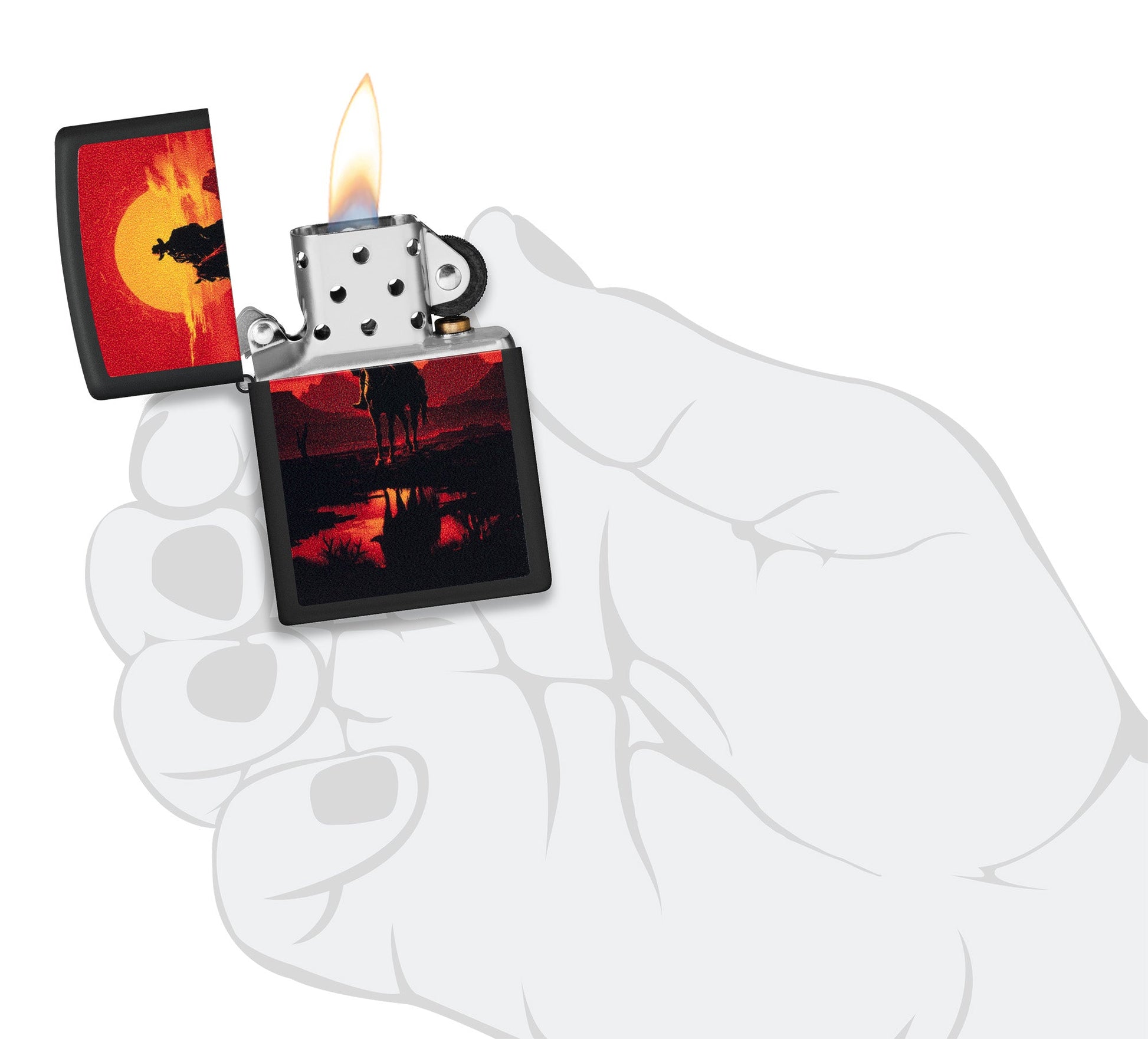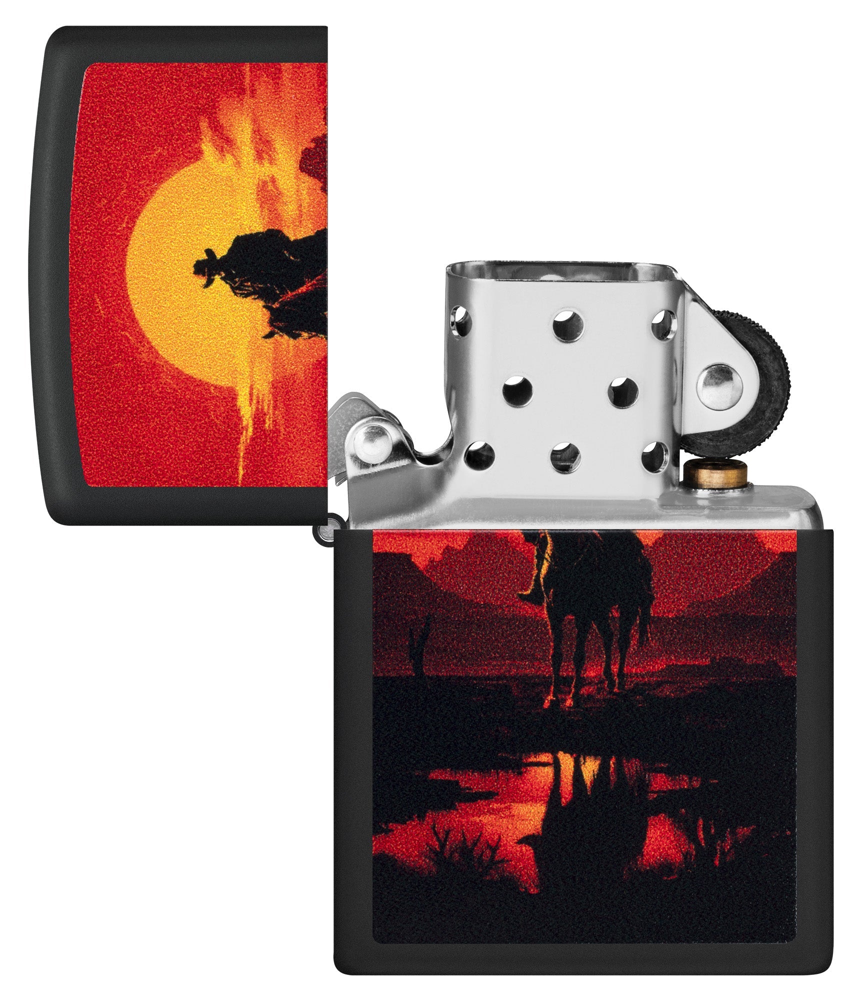 Na tle płonącego pustynnego zachodu słońca kowboj na koniu pozuje na powierzchni tej klasycznej zapalniczki o matowym czarnym wykończeniu w intensywnym wzorze wykonanym techniką nadruku kolorowego.