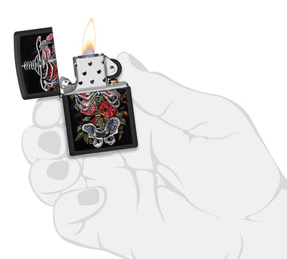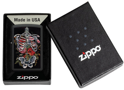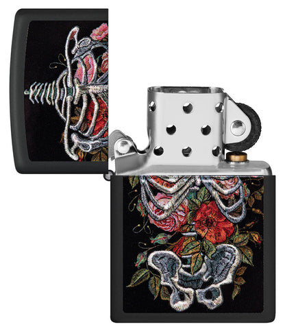 Nawiązując do szczegółowego haftu, ta wspaniała zapalniczka Black Matte przedstawia szkielet nad łożem pokrytym żywymi kwiatami. Dzięki naszemu procesowi Texture Print z powierzchni zapalniczki wyłania się mroczny romantyczny wzór.