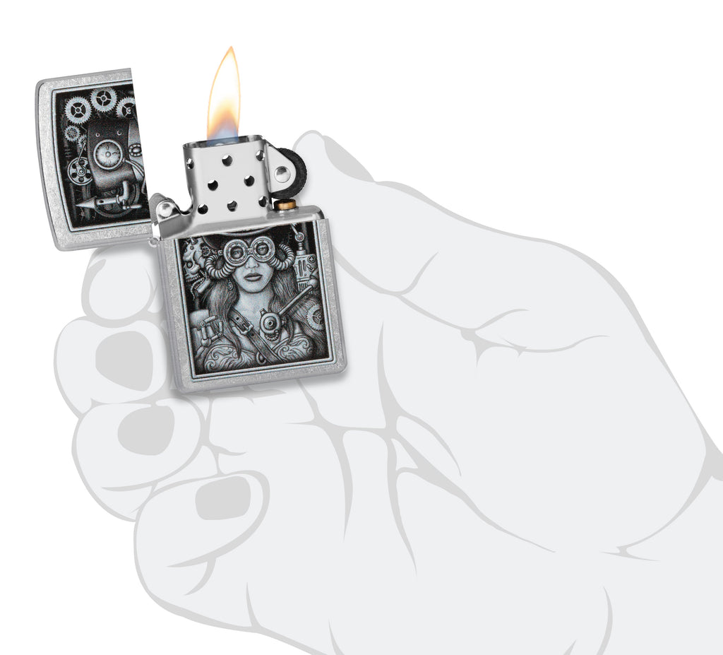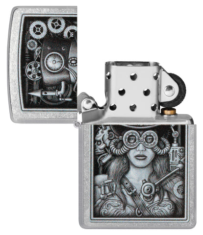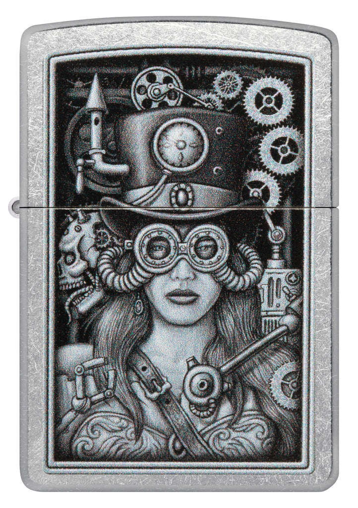 Inspirowany steampunkiem wzór Color Image na tej klasycznej zapalniczce Street Chrome przedstawia aeronautę wyposażonego we wszystkie dzwonki i gwizdki.