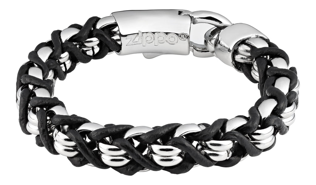 Skórzana bransoletka o okrągłym przekroju wykonana z pierścieni ze stali nierdzewnej oplecionych skórzanymi sznurkami. Bransoletka ma bezpieczne zapięcie z haczykiem. Od wewnątrz zapięcie jest ozdobione napisem Zippo. Po zewnętrznej stronie znajduje się płomień Zippo. 20cm.