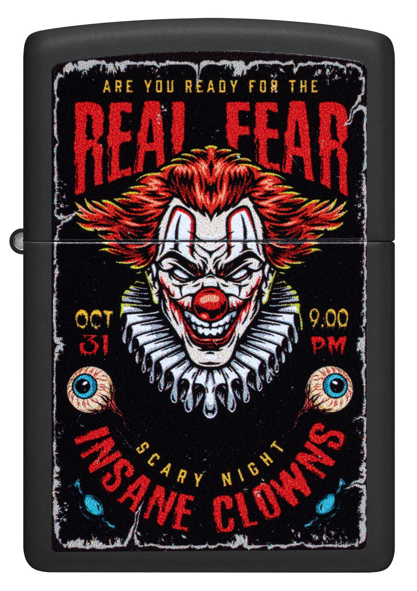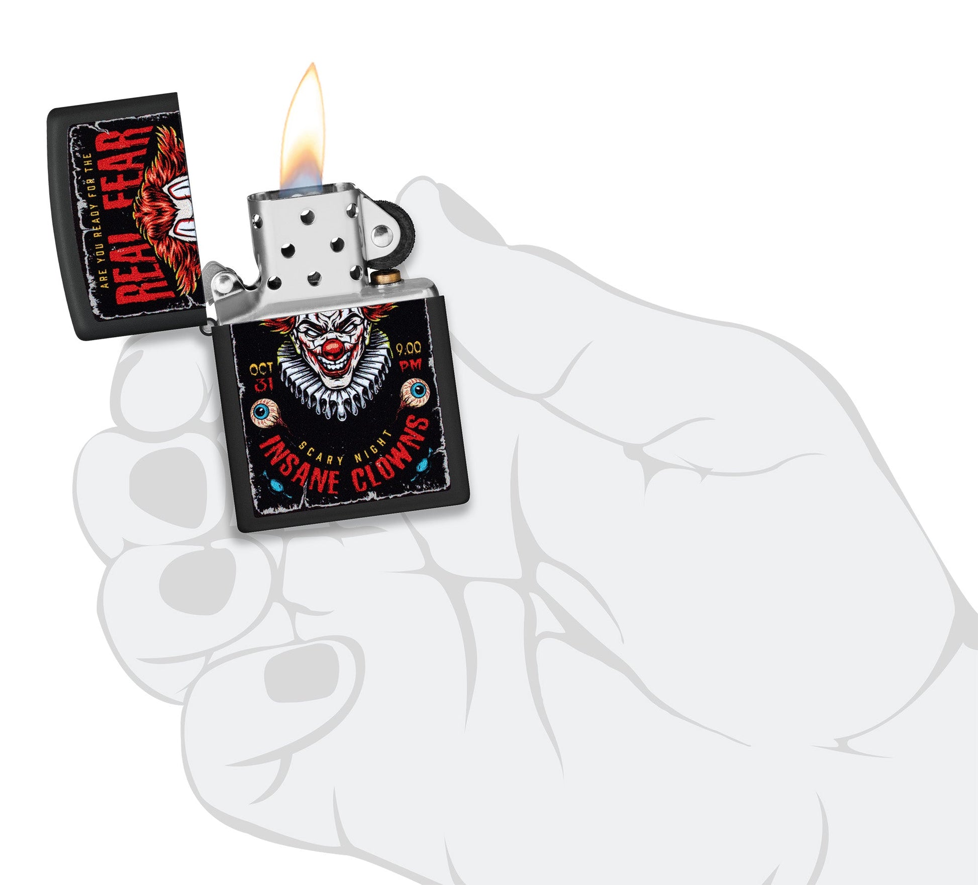 Strachy i dreszcze Halloween trwają przez cały rok dzięki tej klasycznej zapalniczce o matowym czarnym wykończeniu. Niepokojący wzór wykonany techniką nadruku kolorowego przypomina plakat w stylu retro z przerażającym klaunem.