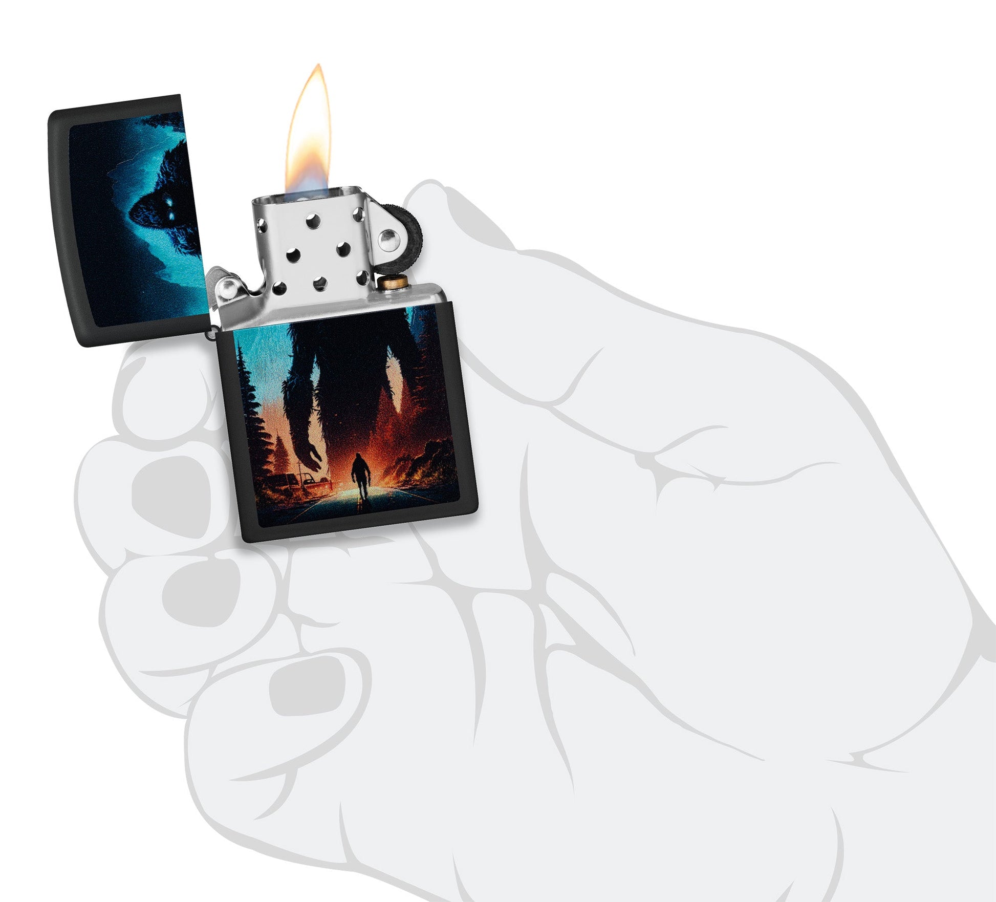 Na tej klasycznej zapalniczce o matowym czarnym wykończeniu ogromna Wielka Stopa góruje nad rozświetloną księżycem drogą. Upiorny wzór wykonany techniką nadruku kolorowego rozświetla się pod wpływem światła ultrafioletowego dzięki specjalnemu procesowi z efektem światła czarnego.