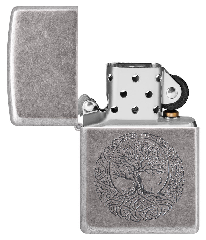 Na tej klasycznej zapalniczce Antique Silver ozdobionej w procesie Lustre odtworzono kultowy symbol drzewa życia, które reprezentuje więź z naturą, przeszłością i teraźniejszością.
