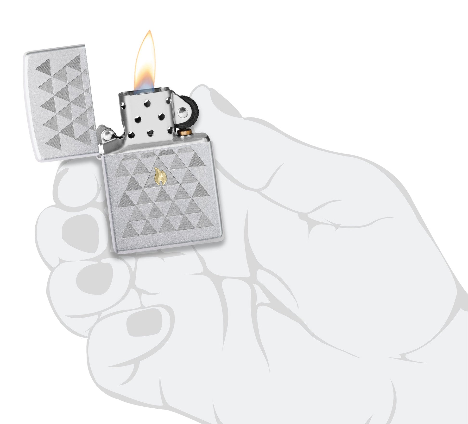 Na tej klasycznej zapalniczce Satin Chrome znajduje się hipnotyzujący motyw trójkąta w wyrazistym stylu Auto Two-Tone, którego centralnym punktem jest ikona płomienia Zippo w kontrastowym, mosiężnym odcieniu.
