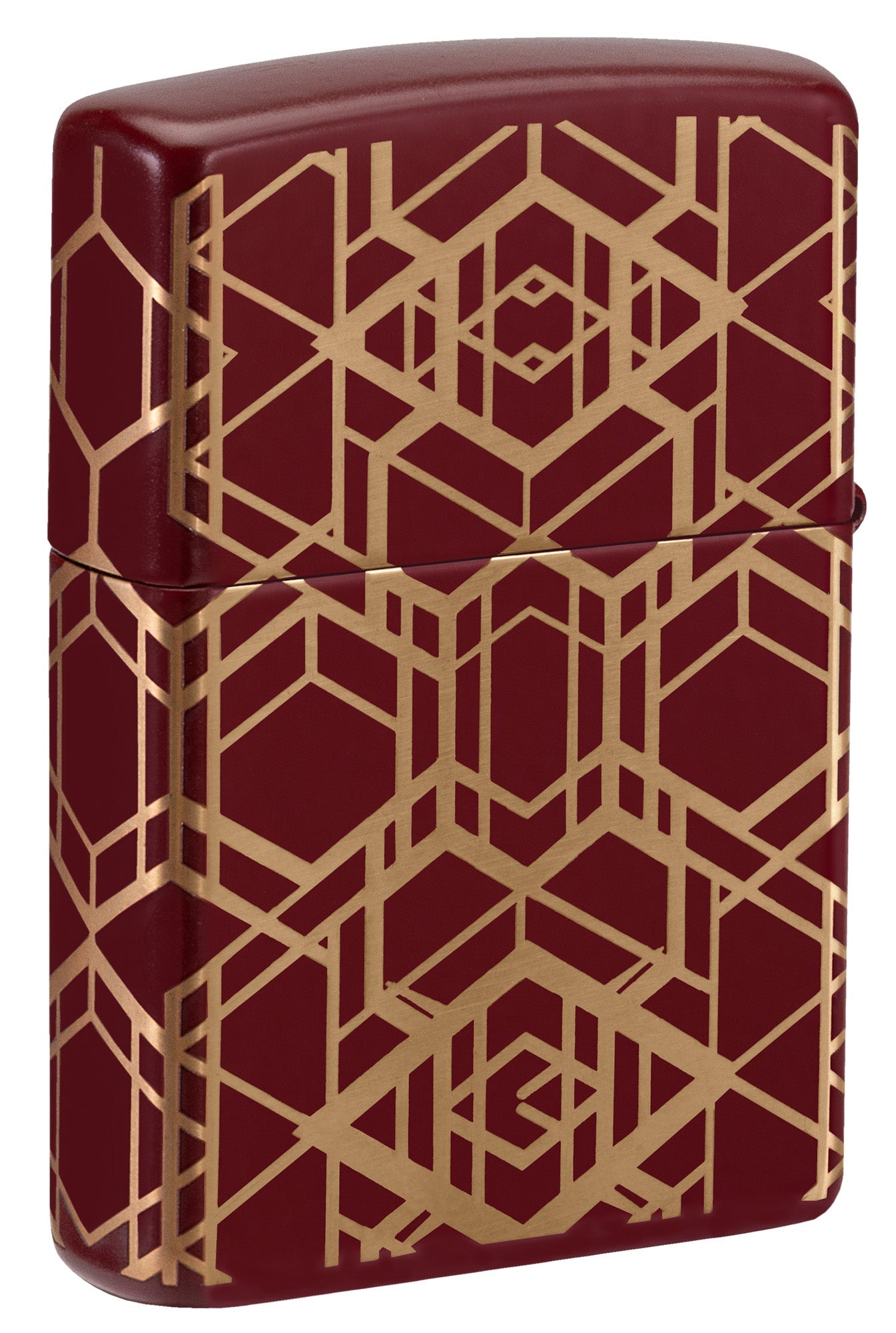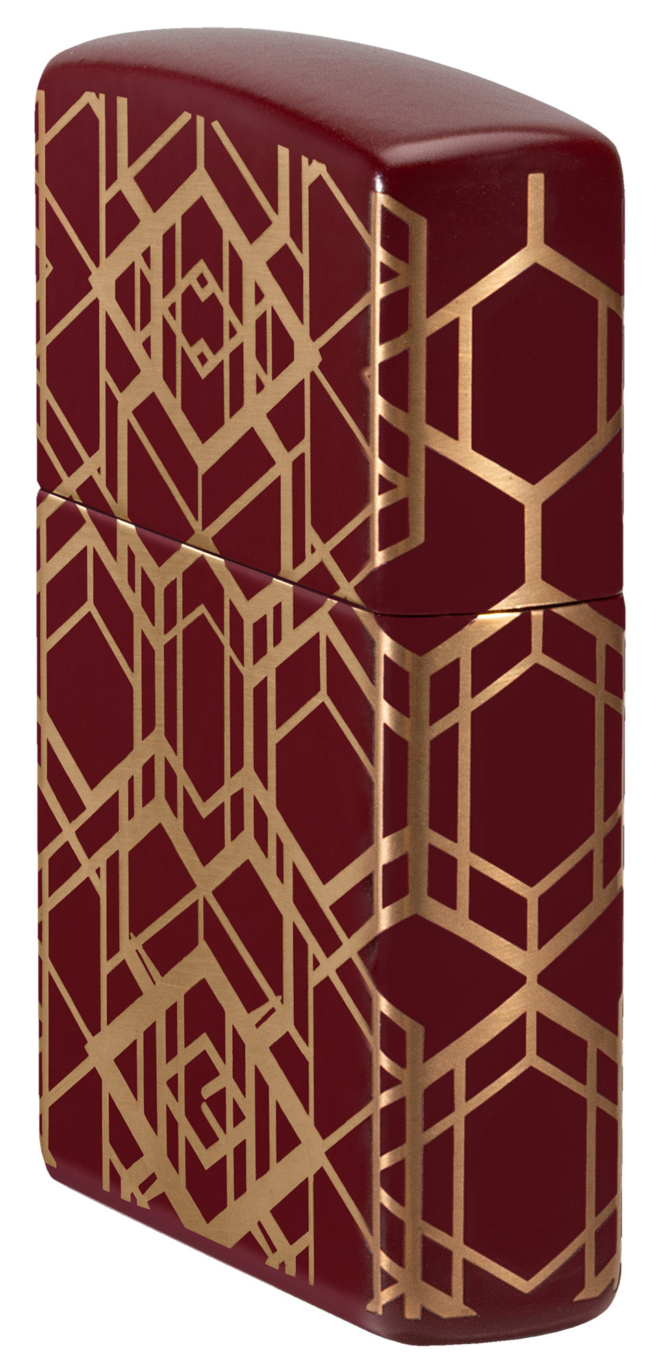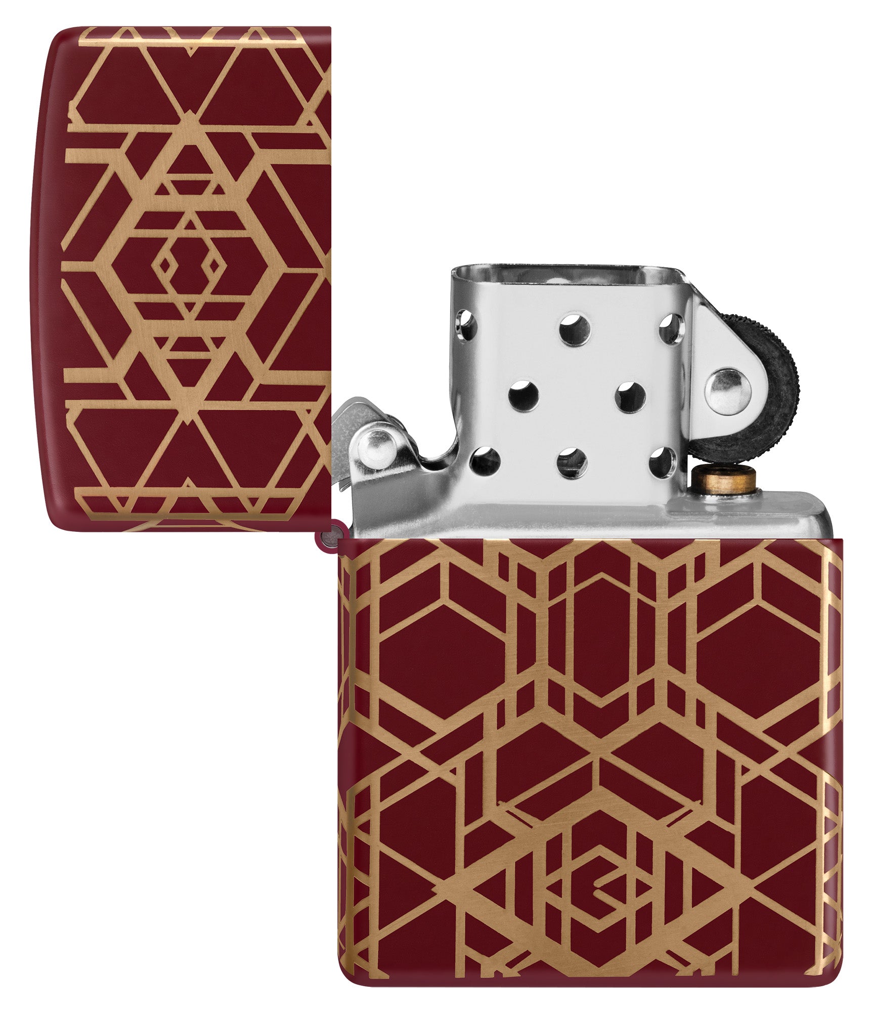 Wszystkie strony tej klasycznej zapalniczki w kolorze Merlot oplatają hipnotyzujące linie w precyzyjnym, płynnym wzorze Laser 360°, odsłaniając błyszczącą mosiężną powierzchnię ukrytą pod matowym wykończeniem.