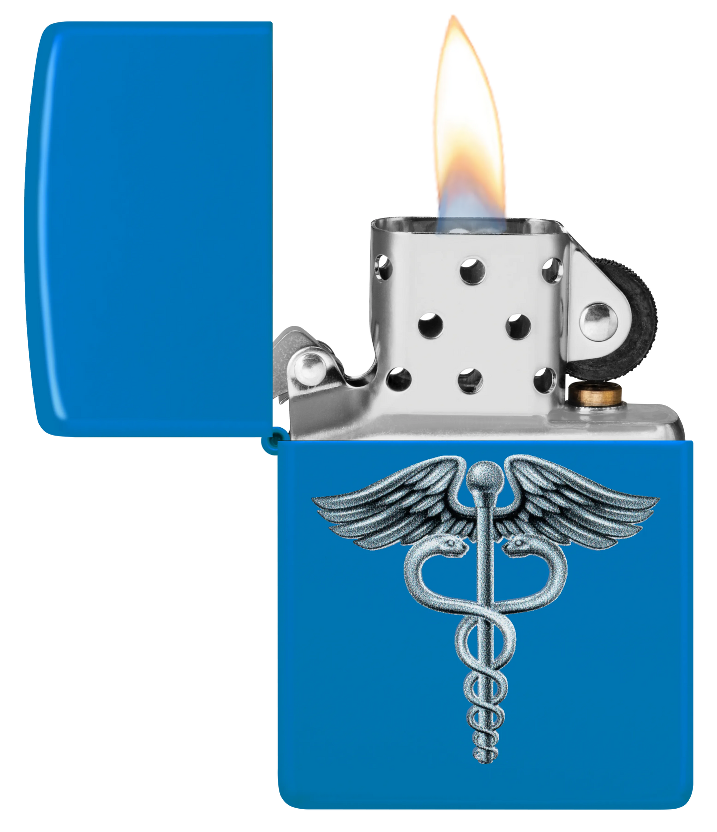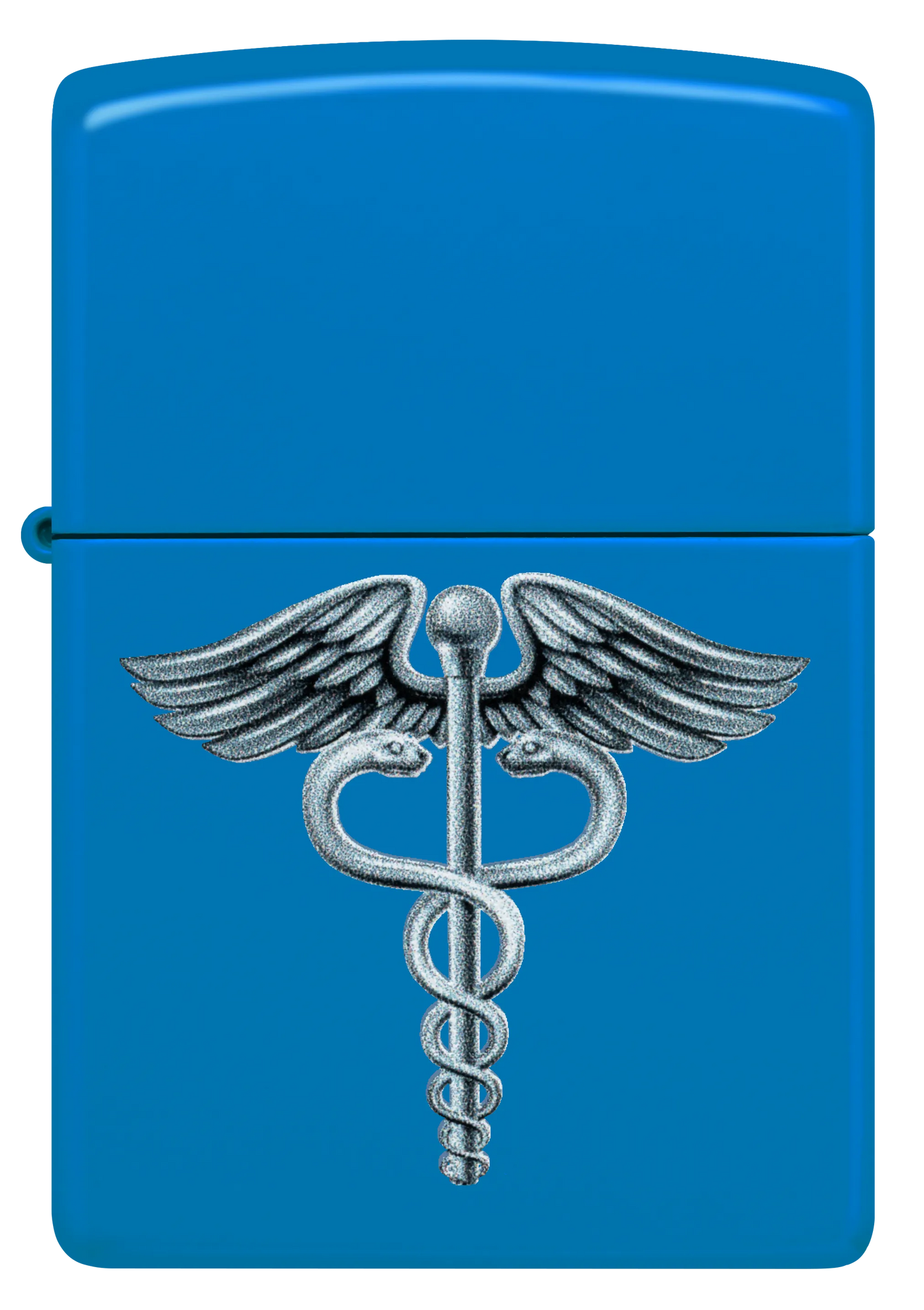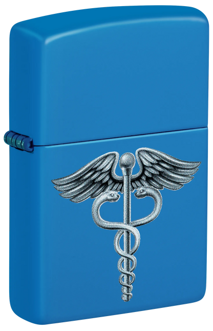 Symbol kaduceusza, poczynając od mitologii greckiej, a kończąc na współczesnej medycynie, symbolizuje pokój, komunikację i mediację. Na tej klasycznej zapalniczce Sky Blue Matte ozdobionej przy użyciu odważnego wzoru Color Image odtworzono uskrzydloną laskę splecioną z dwoma wężami.